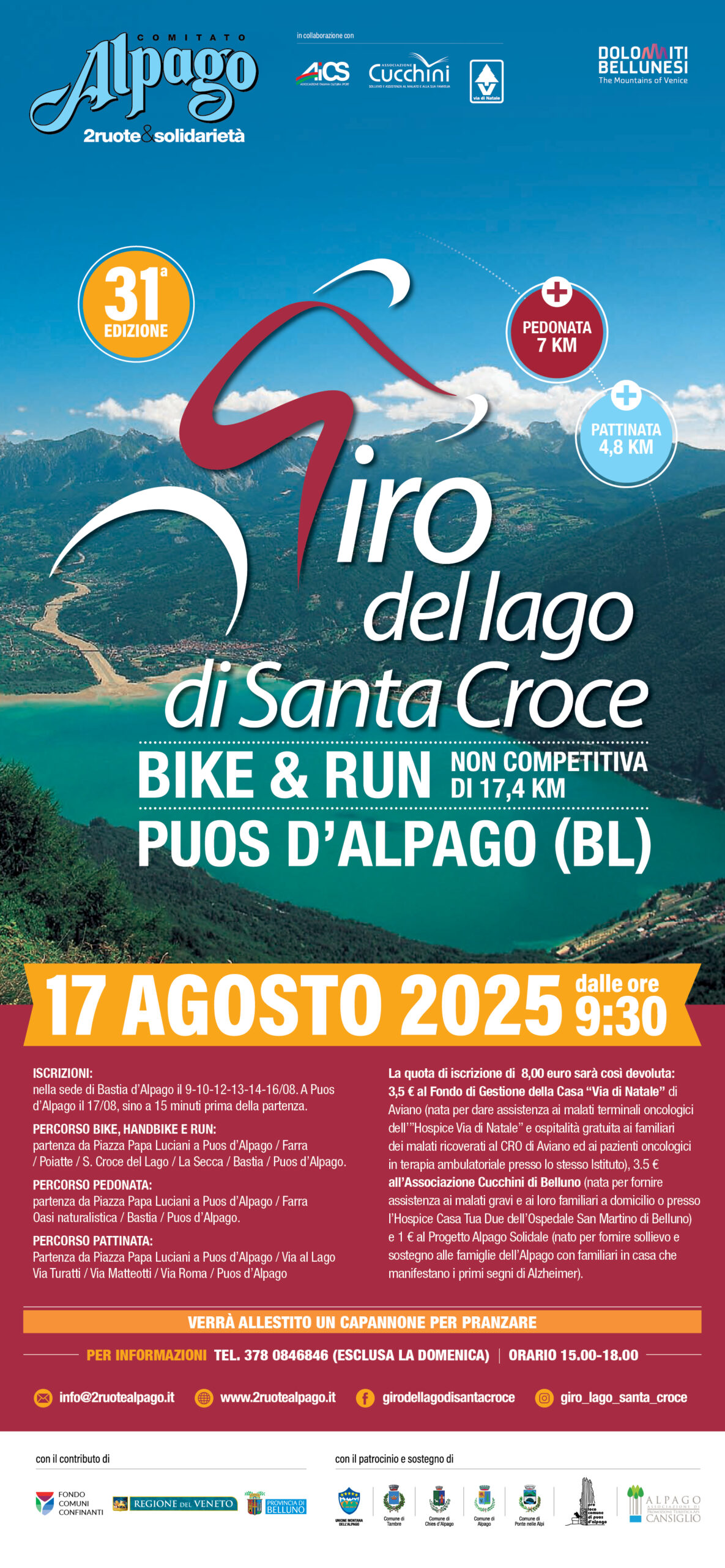 Lo scopo del Giro del Lago di Santa Croce è quello di raccogliere fondi per sostenere le attività dell’Associazione “Via di Natale” di Aviano e dell’Associazione Cucchini di Belluno, entrambe realtà che danno assistenza ai malati gravi e terminali oncologici e supporto alle loro famiglie.